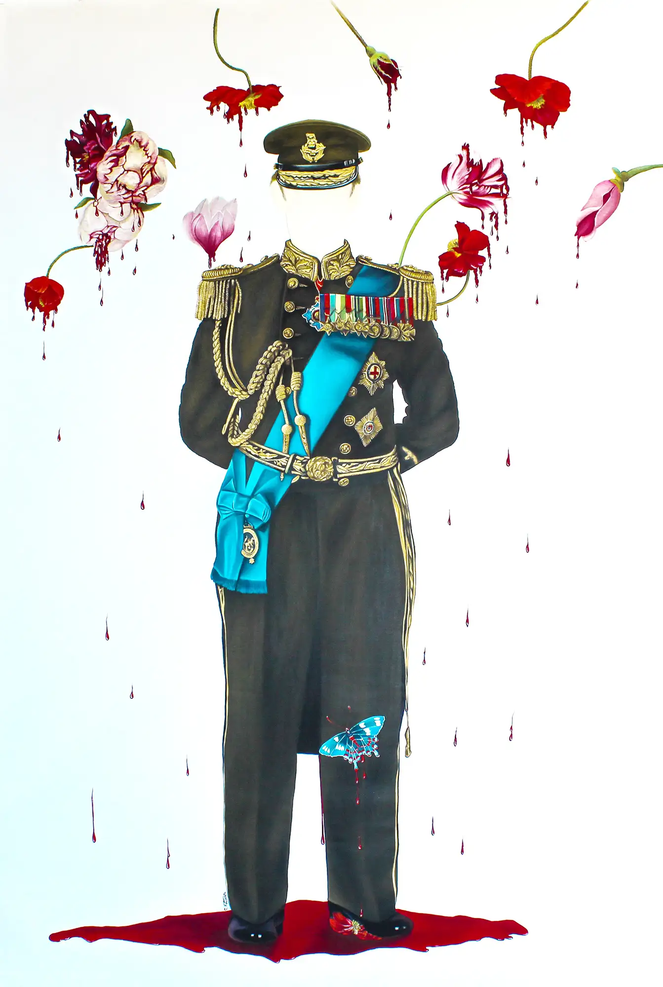 The work addresses power as a regime of representation and discipline. The figure is stripped of its face, shifting attention away from individual identity toward the institutions that produce and regulate it. The body functions as a carrier of institutional violence and historical continuity. The uniform does not signify an individual, but a mechanism. Flowers, as symbols of beauty and life, coexist with bleeding, undermining their romanticized reading and exposing the violence that is often concealed behind rituals of honor, order, and normality. The work does not narrate an event; rather, it activates a field of reflection on legitimized violence and the silence that accompanies it. The viewer is invited to consider their own position within this symbolic economy, where the beautiful and the traumatic coexist inseparably.